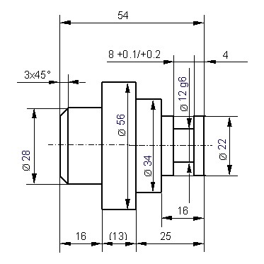Eine Welle bzw. Drehteil wird bei einer Einzelteilzeichnung stets in Fertigungslage gezeichnet und bemaßt. Dabei gilt es darauf zu achten, dass sich die Seite mit den meisten bearbeiten Absätzen auf der rechten Seite befindet. Zusätzlich sollten bei der Bemaßung von Drehteilen die Durchmesser wechselweise rechts und links von der Zylinderachse angetragen werden. Die Länge eines Absatzes wird so bemaßt, wie auf der Drehmaschine gefertigt wird. (Siehe Maße 16 und 25) Bei speziellen Funktionsmaßen (im Beispiel: Durchmesser "12 g6") kann von letztgenanntem Grundsatz abgewichen werden. Die Breite muss hier eine bestimmte Funktion erfüllen und bekommt daher ein eigenes Funktionsmaß. ![]() |