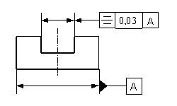Die tolerierte Mittelebene der Nut muss zw. zwei parallelen Flächen (Abstand 0,03 mm) liegen, welche symmetrisch zur Ebene A der bemaßten Außenflächen angeordnet sind. |