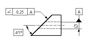 Die tolerierte Neigungsfläche muss zw. zwei zur Bezugsachse A geneigten parallelen Ebenen mit Abstand 0,25 mm liegen. (Der geometr. ideale Winkel muss 45° aufweisen) |